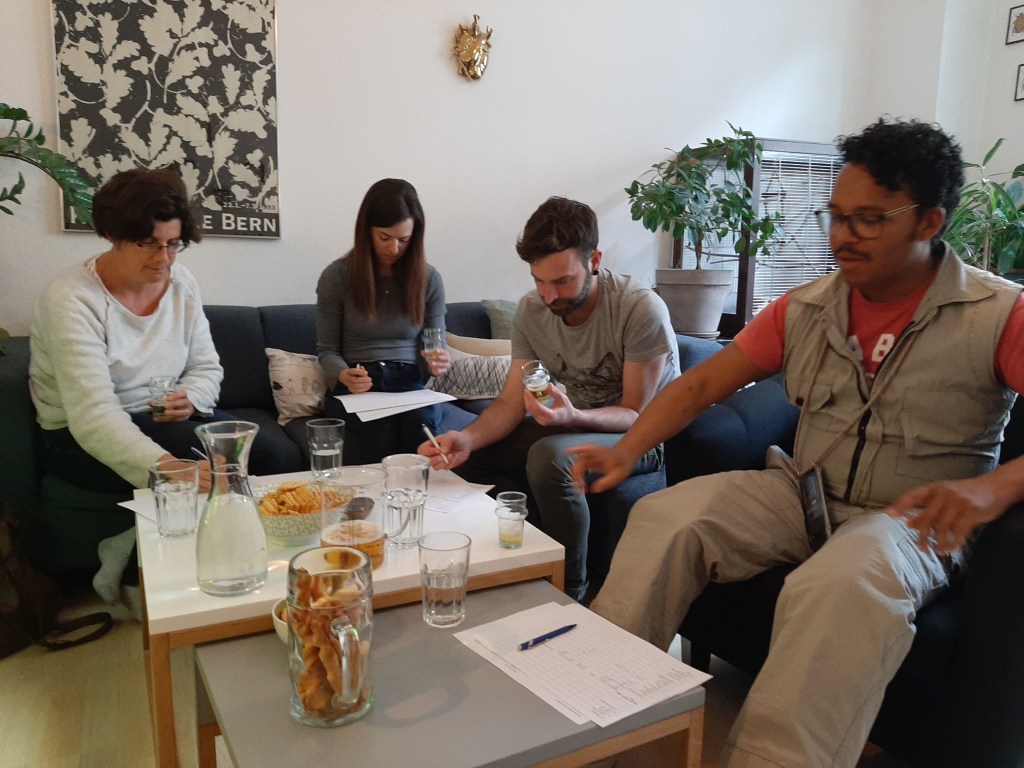 Maintenant, que tout ça c’est bien clair. Il est temps de passer aux choses sérieuses. Soit la dégustation. Pour ce faire, j’ai donc réuni cinq personnes (plus moi), des buveurs de bières expérimentés et enthousiastes. En tout, trois filles, trois garçons, parité oblige. Nous avons donc Michèle, amatrice de bière qui a travaillé durant des années pour le groupe Heineken, Viviane, ancienne réfractaire convertie à la bière en 2013 lors d’un voyage à Bali, David, roi de l’apéro qui a toujours des bières dans son frigo – on ne sait jamais –, Tobia, pour qui « une bière par jour, le bonheur toujours » pourrait être la devise et last but not least Didier, cuisinier de profession, patron de bar et gastronome confirmé. Bref, une belle brochette de buveurs de bière à qui on ne la fait pas.