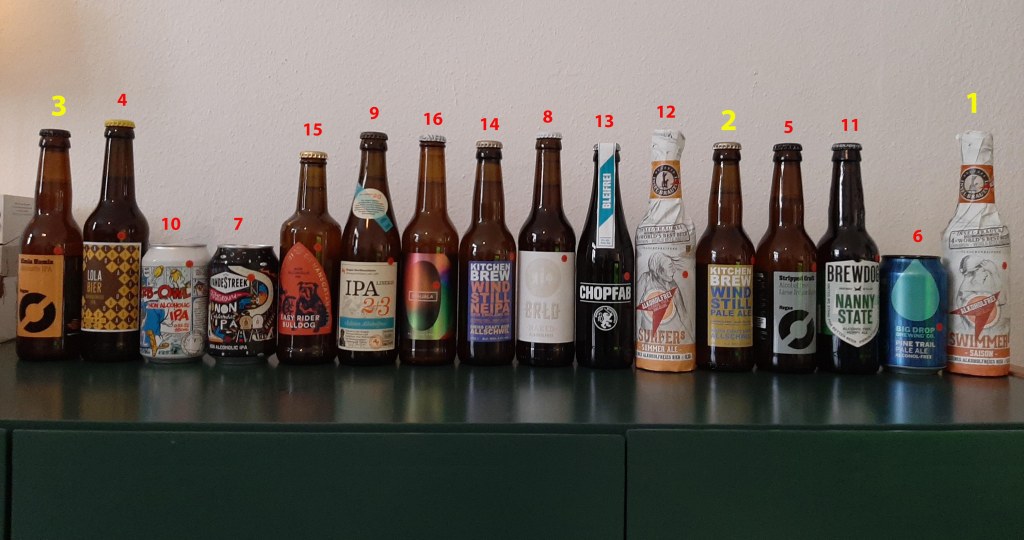 Les ales et plus particulièrement les IPA conviennent parfaitement à une version sans alcool. Plus fortes en houblon, et donc en goût, elles apportent l’amertume recherchée dans une bière et pourraient facilement être confondues avec une variante alcoolisée. Les ales sont nombreuses dans ce classement (qui reflète également leur prédominance sur le marché) ce qui a rendu difficile leur différenciation, la plupart ont obtenu des notes tout à fait satisfaisantes mais peu sont sorties du lot unanimement. Autre point positif: l’effort mis sur le visuel, souvent très sympa et trendy.